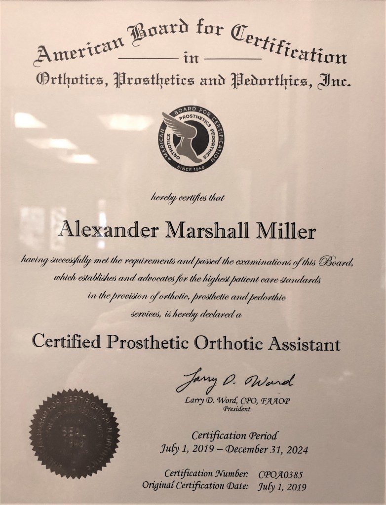 Certifications ABC Certified Prosthetic Orthotic Assistant, CPOA Ohio Willowwood Omega Scanner Training Share this: Click to share on X (Opens in new window) X Click to share on Facebook (Opens in new window) Facebook Like Loading...